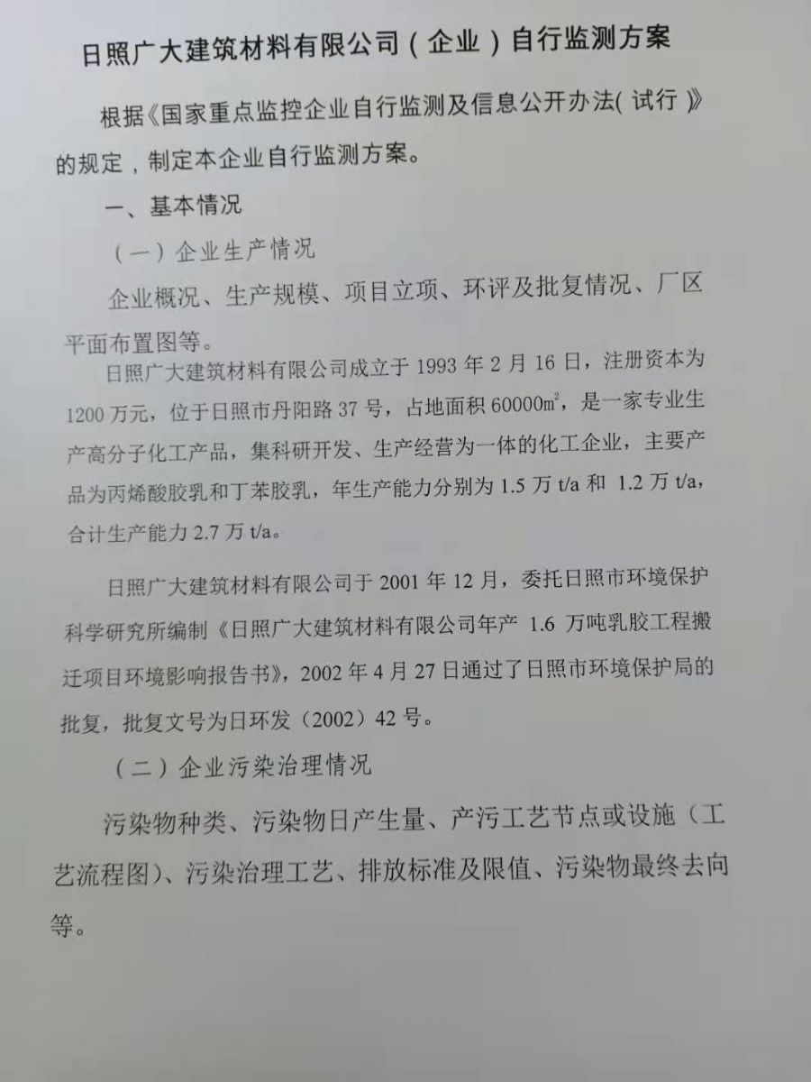 日照廣大建筑材料有限公司,位于風景秀麗的海濱城市山東日照,成立于1988年,是專業(yè)生產高分子化工產品,集科研開發(fā)、生產經營為一體的化工企業(yè),主要產品為丙烯酸脂類乳液和丁苯膠乳。是國內目前江北同行業(yè)產銷量最大企業(yè)之一。